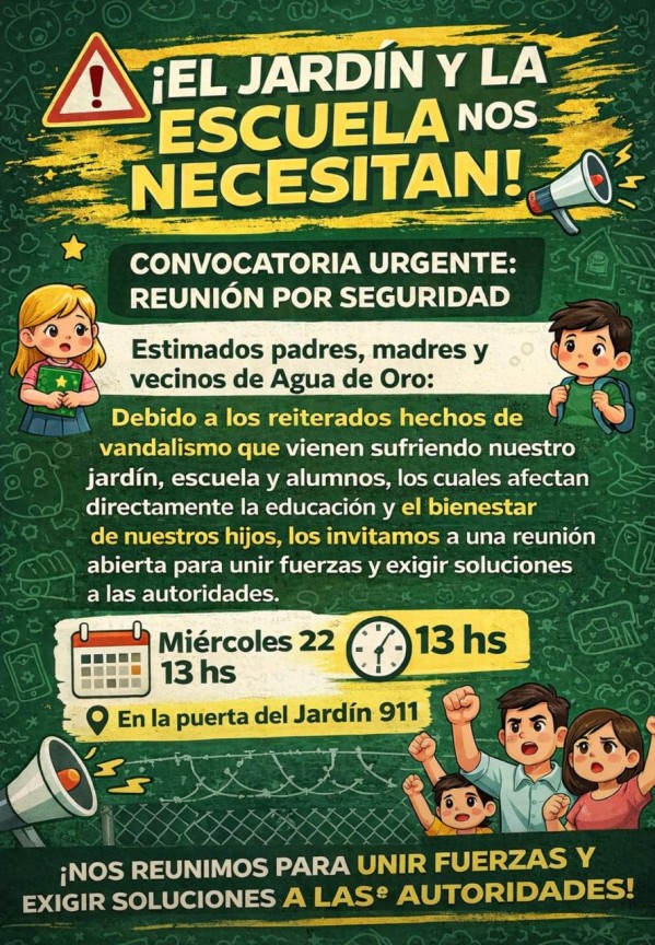 Además, el Jardín de Infantes de Agua de Oro, solamente en 2025, fue blanco de la in seguridad en tres ocasiones (dos veces se llevaron el tanque de agua y en la última ocasión otros elementos de valor).