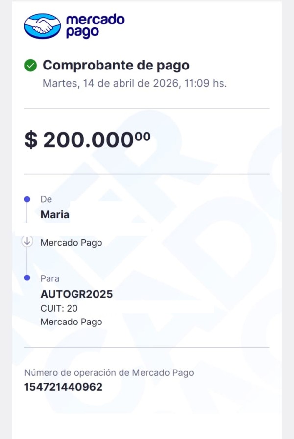 En la denuncia se agrega –como ilustra la imagen del comprobante que acompaña esta nota- que la transferencia fue enviada a una cuenta a nombre de AUTOGR2025, de Mercado Pago.