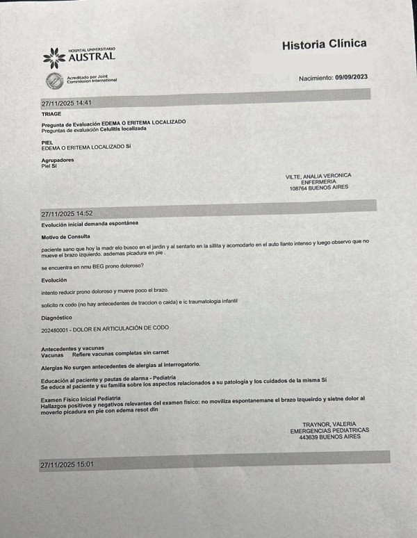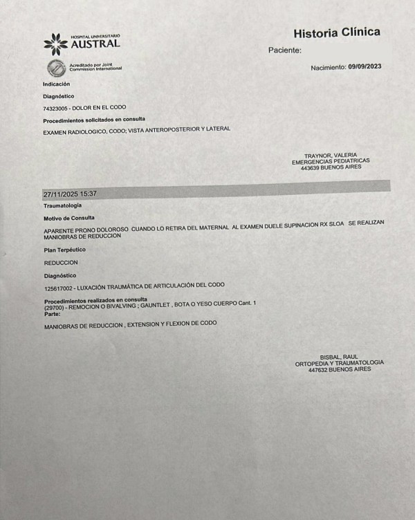 Según consta en la Historia Clínica que se realizó en el Hospital Universitario Austral, el nene sufrió “prono doloroso”, lo que por definición es una lesión que se produce por tracción longitudinal brusca de la mano mientras el antebrazo está pronado y el codo extendido.